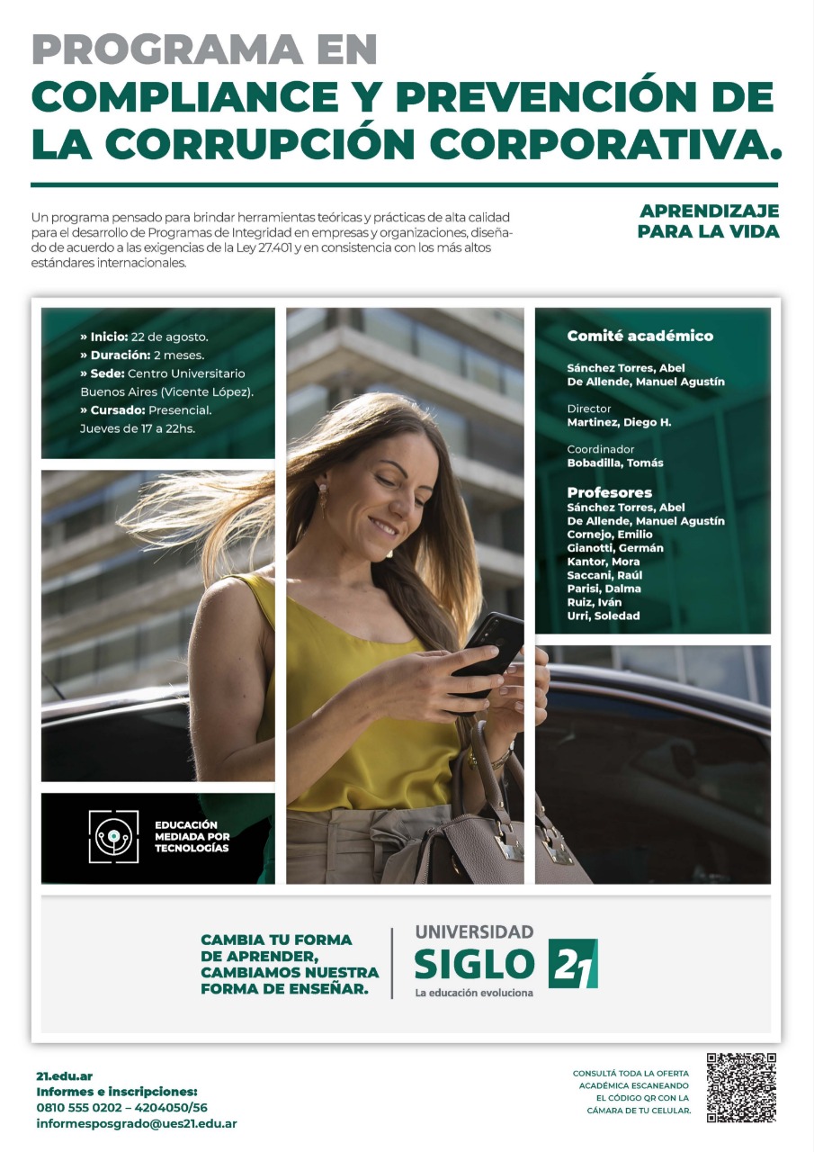 Tengo el gusto de dirigir y ser docente (junto con algunos colegas de primer nivel) en el Programa de compliance y prevención de la corrupción corporativa de la Universidad Siglo 21 Son 8 sesiones de 5 horas y se dicta en paralelo en Vicente Lopez y en Córdoba. Arranca muy pronto: Vicente Lopez: jueves 22…